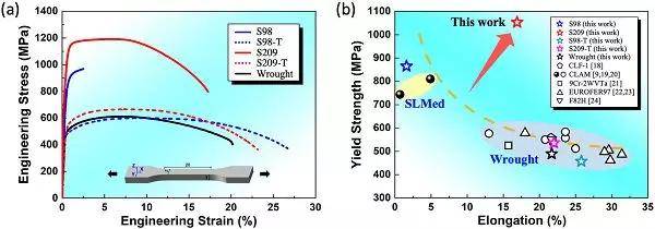 图2.SLM成形高强韧CLF-1钢的室温拉伸性能及其与目前你文献报道性能的对比结果