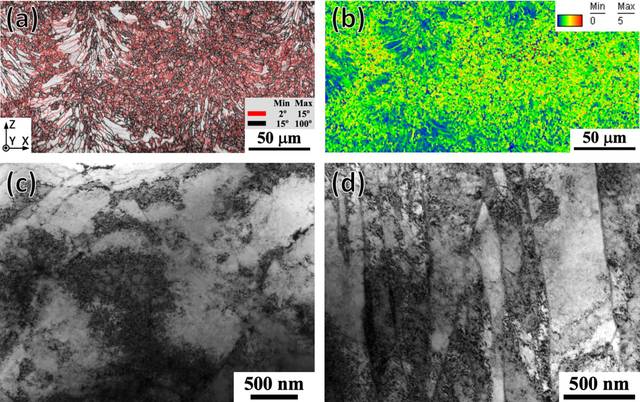 Deformation structures of the S209 tensile strained to (a–c) 2.5% and (d) fracture. (a) EBSD image quality map with superimposed LAGBs (red line) and HAGBs (black line) and (b) corresponding KAM map. TEM BF images at the location of (c) coarse grains and (d) lath martensites.