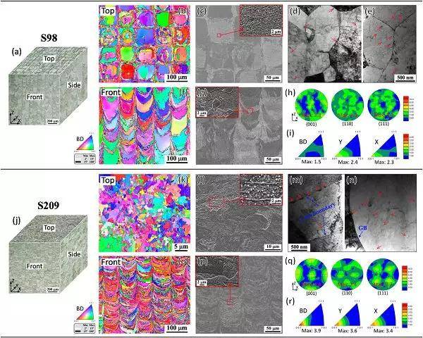 (a, j) 金相显微组织;(b, f, k, o) EBSD IPF图;(c, g, l, p) SEM图;(d, e, m, n) TEM明场像;(h, q) 极图;(i, r) 反极图