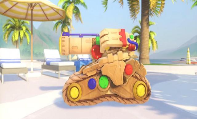 首先从三个9胜皮肤说起吧,猎空的皮肤大家一看都知道是英国国旗的标志,奥丽莎的皮肤也没有特别的意义,就是夏日里的冰淇淋让人可以解暑降温。而堡垒的沙地皮肤则是一个很具有夏日特征的皮肤了,它的全身都是由沙子构成的,这很像国外人民每年夏天特别喜欢的沙雕文化节,他们喜欢用沙子雕刻成各种各样的形象。再看堡垒身上那些彩色的物品,也是从小孩子们最喜欢的玩沙玩具里取材的,最后再仔细看看堡垒的头,是不是和玩沙时的沙桶特别相似。
