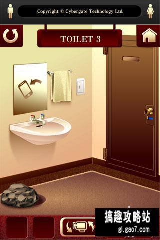 进入TOILET 3 中,发现地上有一块石头和一个红色的按钮。墙上的镜子上面有一幅手机向左倾斜的画面。