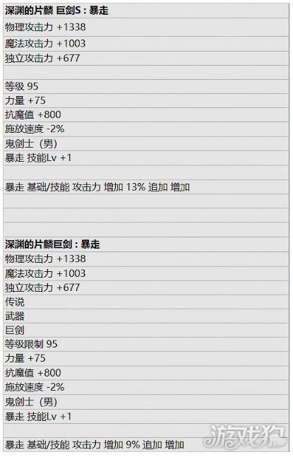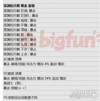 此次主要是那红眼作为一个实例说明,因为这个职业玩家在国服是占比非常多的,自然要拿到前面来说明一下。首先是武器深渊的片鳞巨剑S暴走技能攻击力增加13%,暴走技能lv+1。第二种普通的深渊的片鳞巨剑没暴走技能Lv+1技能攻击力增加9%。然后就是防具,防具是不增加属性的,但是6件套是暴走技能攻击力加成4%,9件套暴走技能攻击力增加24%,暴走技能Lv+1。记住各职业的数值是不一样的。