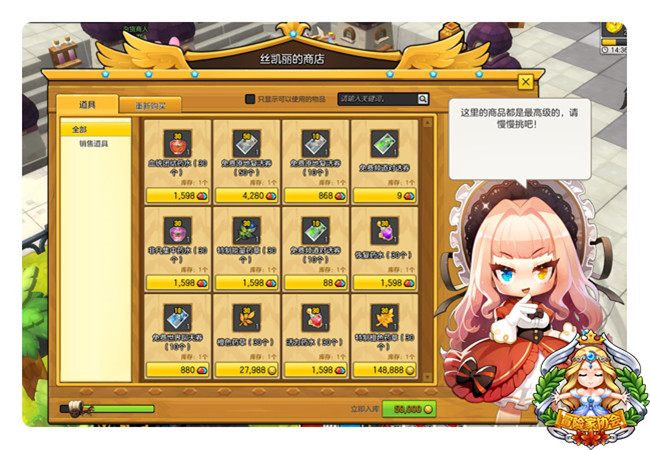 其七,蓝蘑菇币还可花在幸运商人处,用于购漏有奇效的药水和频道聊天券。幸运商人即在【特莱雅涂的【幸运商人 丝凯垃如果不满意丝凯捞品,还可通过花费酵蓝蘑菇币【立即入库】,刷新商品界面。