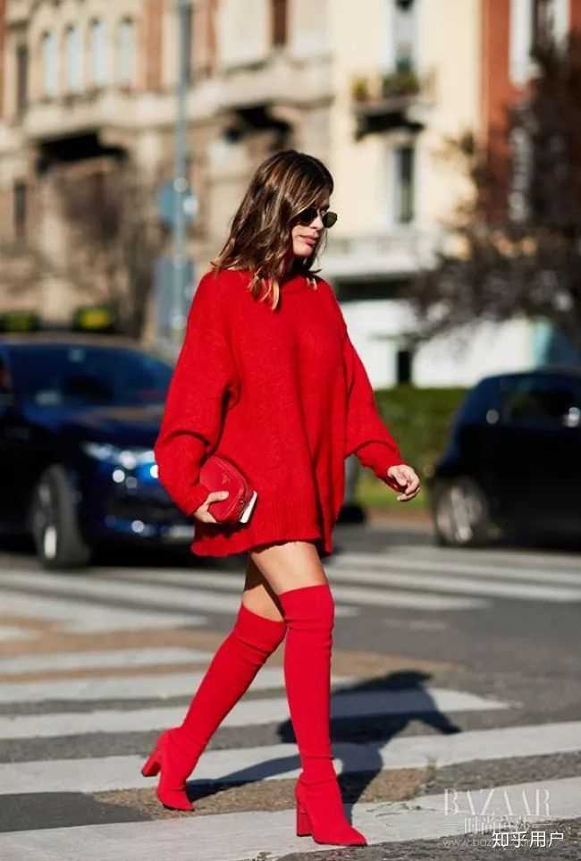 红色的过膝长靴可是今冬的一大亮点~搭配宽松的红色毛衣拉长腿部线条,整身红色的Look分分钟让你时髦又chic!