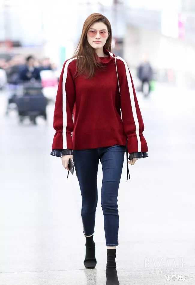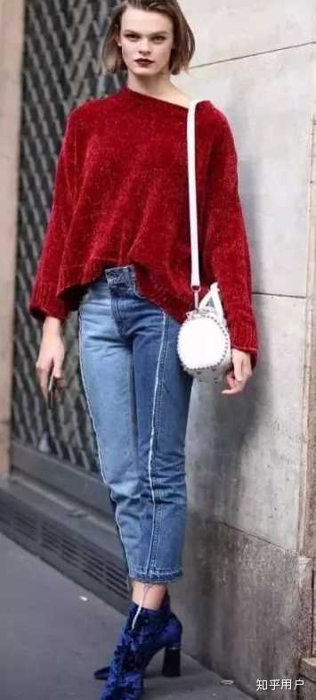 亮晶晶地圣诞红毛衣显得气色格外好!撞色搭配一双蓝色绒面踝靴可以说是仙女本人了。