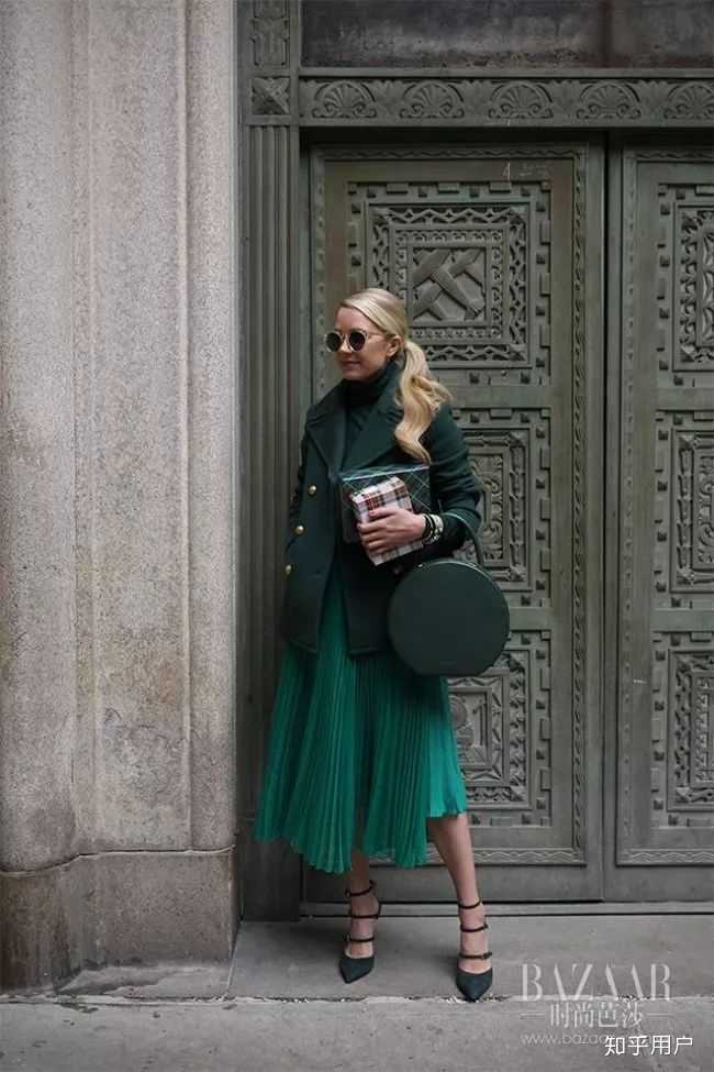 绿色同色系的搭配也太好看了吧!不同层次的绿色与圆形包撑起了整个冬天呢!