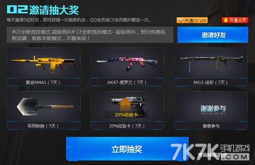 每天邀请5位好友,即可获得一次抽奖机会,QQ会员或CF会员额外赠送一次。