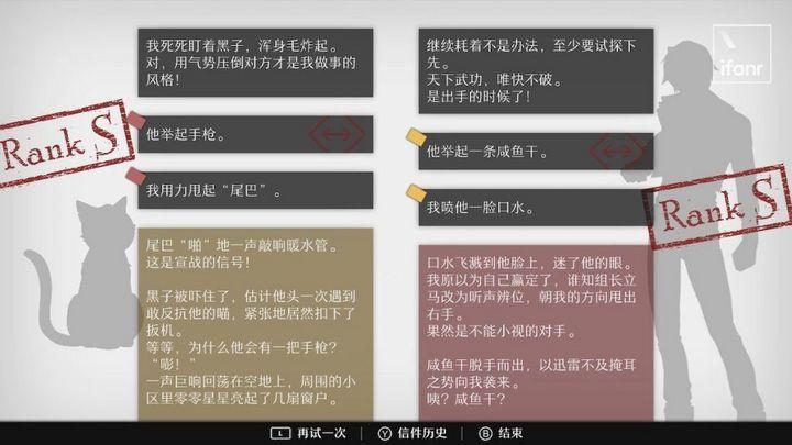 如果单从各自的信件来看,无论怎么调整因果关系,大黄和张京民都难逃厄运——但是,无视客观规律的你,却可以通过交换一只猫和一名警察的境遇,来改变彼此的命运,就像这样——