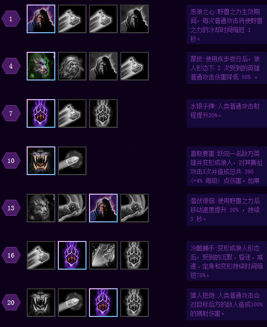优点:一个合格的远程输出英雄,并拥有变狼突进的收割能力。从数据上看他的远程输出点人能力仅次于雷诺、坦克,而他变身狼人的肉搏能力则直逼萨尔等近刺的水准!