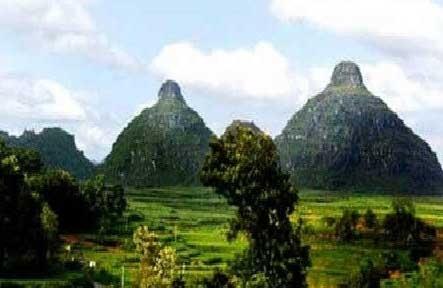 原来,在农水镇南面有一座神秘的双乳山,这是两座拔地而起呈半圆型的山包。整个山包密密麻麻地生长着一种灌木杜鹃,当地人叫阳瓜花。而两山山顶均有突出的球状青石,且两个突出的石尖十分对称均匀。