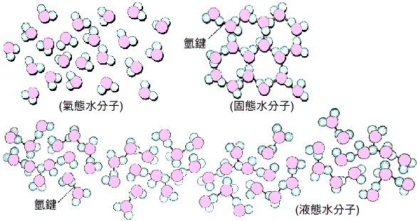 构成液态水和固态水的水分子之间存在着氢键。因此,我们这里要搞清楚一个问题,那就是水分子并不是一个紧挨着一个的,事实上,分子之间是有间距的。