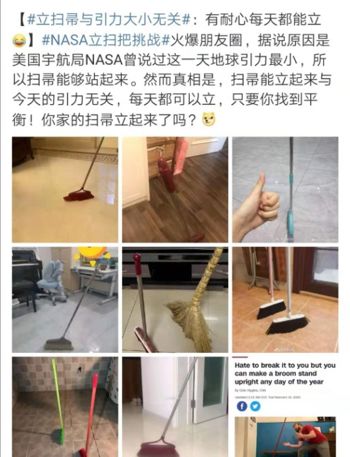 打开朋友圈发现立扫把是什么意思,好多人都开始在家立扫把,不知道的还以为这又是什么“迷惑行为”,原来是美国宇航局NASA曾说过这一天地球引力最小,所以扫把能够立起来。看到图片还以为霍格沃茨魔法学校也开始线上教学了!