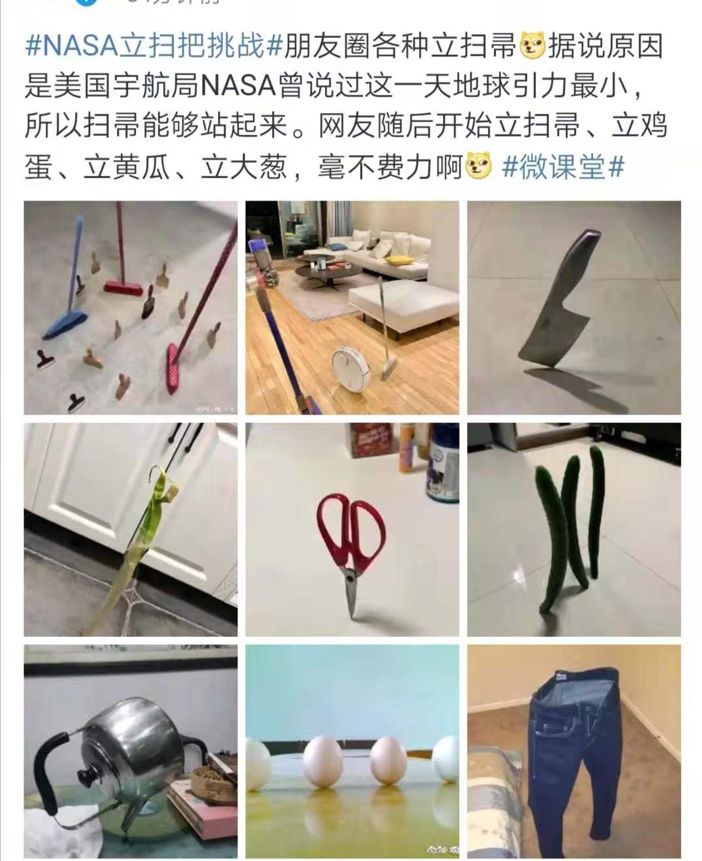 然而真相却是:扫把能立起来与这一天的引力无关,只要找到平衡,每天都能立起来,也和NASA没有什么关系。虽然说“谣言”被击破了,但是不得不承认这是疫情发生这段时间 最温情的“谣言”了,看着朋友圈里的“立扫把大赛”还莫名觉得好笑,也给宅在家里的我们解了闷儿。