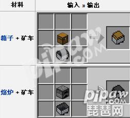 合成:在工作台中,1个矿车加1个箱子按上图铺开可以获得1个运输矿车,具体如下图:
