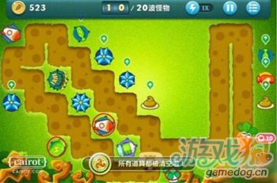 首先在萝卜的右侧建造一个满级风扇,目的是辅助清除道具,打掉萝卜左上方的道具后,建造一个能快速清除道具的防御塔来爆出它左上侧的火箭,小编选择的是毒针,效果不错!有钱后一定要多多建造雪花(如图04),虽然我们的防御塔很少,但是在众多雪花的限制下,依然能轻松获得胜利!