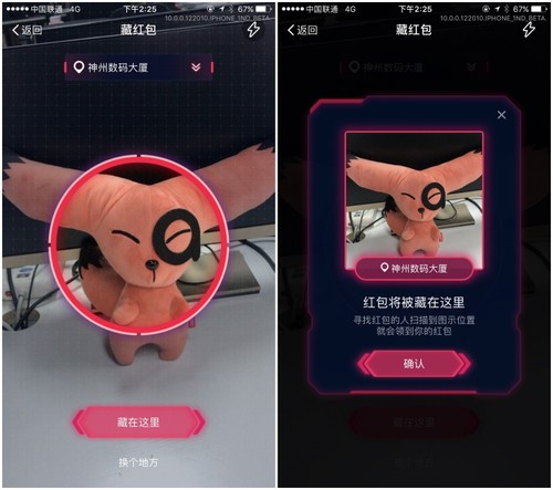 4、找红包时,可以看到一张地图,显示用户周边500米的红包。用户到该位置后,需要用摄像头对准藏红包的物体,即可找到红包。
