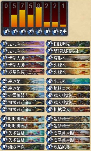 整体思路上是在保留有机械法卡组的核心的基础上能省则省,如果有多余的尘或者是正好有更好的卡牌的话,替换进去当然是更好的选择。比如传送门、炎术士、飞天魔像安东尼、砰砰博士这些花费高一些的单卡。