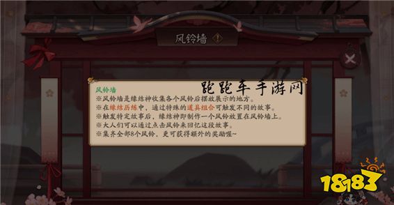 *阴阳师大人们在缘结历练中触发特殊剧情后,可以在风铃墙查看对应的风铃,并获得奖励,集齐全部风铃,更有缘结神的神秘礼物喔!