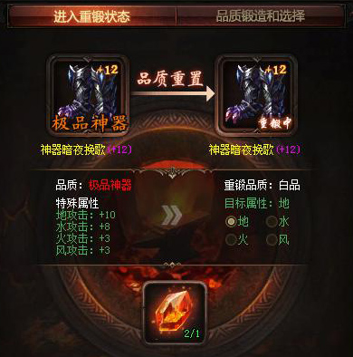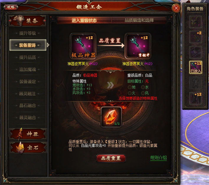 若原装备品质达到极品神器,则需要将重锻装备的品质提升至极品神器,且元素属性不低于重锻前的元素属性,才可选择新属性。