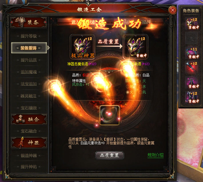 使用灵魂晶石为处于“重锻状态”下的装备进行品质锻造,可以提升装备的品质。装备在达到神器品质前,锻造成功率为100%。