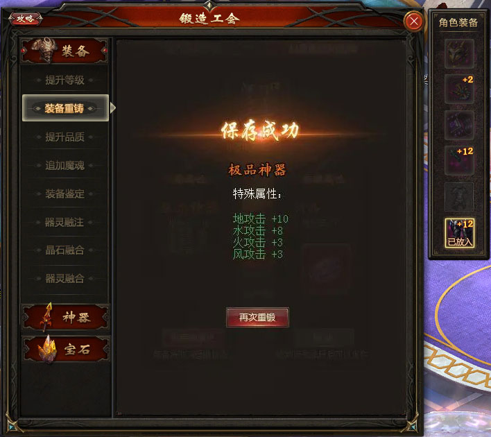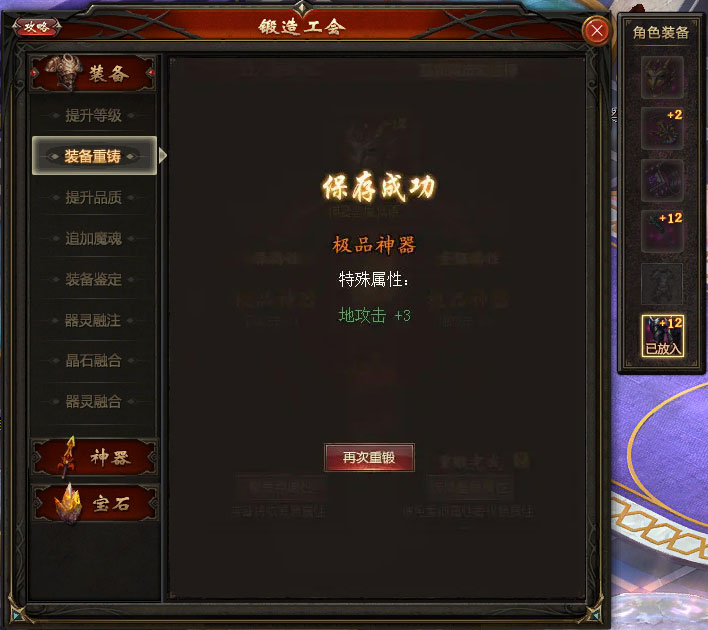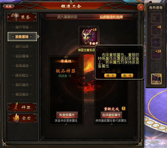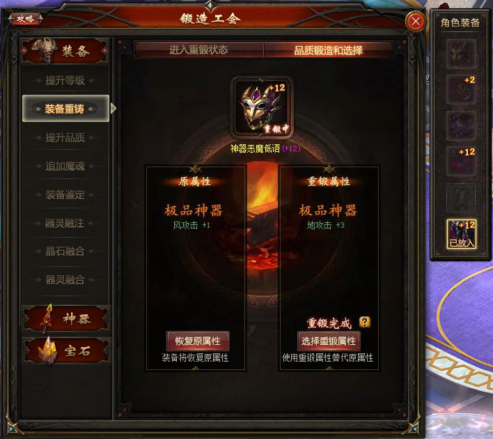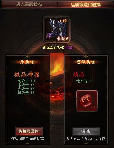 注:若重锻前的装备品质未达精品神器品质,则需要将装备品质提升至精品神器才能选择重锻属性。
