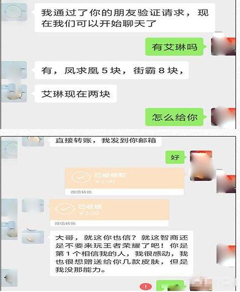 结果刚转账过去,“内部员工”就露出了真面目,反倒给网友一顿嘲讽:大哥王者荣耀艾琳怎么获得,就这你也信?就这智商还是不要来玩王者荣耀了吧!