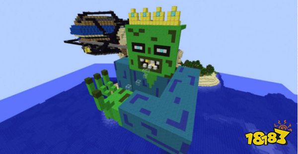 身为僵尸王当然要跟一般的僵尸有所不同,这些不同不光体现在体型上,这只僵尸王就多带了一顶黄金和钻石组成的皇冠,而且举着这“麒麟臂”上还有一只手掌,非常与众不同。
