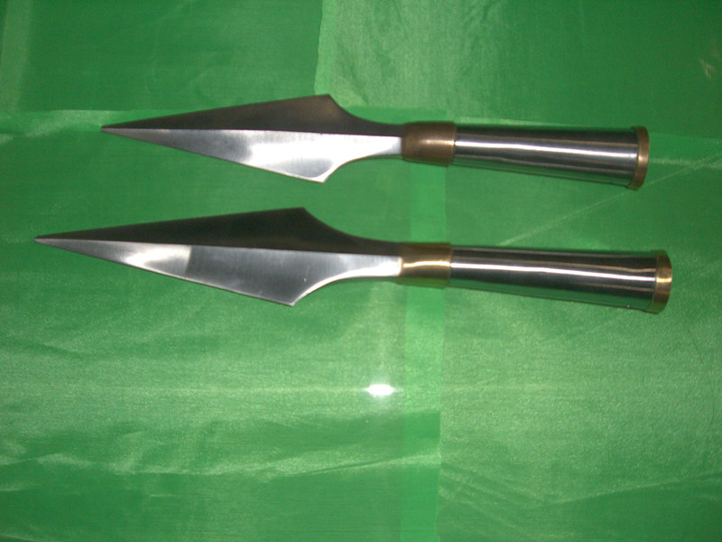 分底座和刺头两部分。刺头长锥状,有锐利尖头。多以菱形和圆锥形为主。长径比较高,穿刺强度大。底座有时是用来与长枪柄结合的圆筒,有时直接是长剑式手柄。具体下面细说。