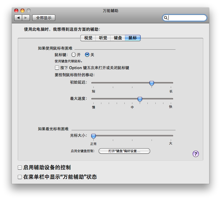 从 Apple 菜单中选取系统偏好设置。从显示菜单中选取语音。点按“文本至语音”标签。如果启用了“按下按键时朗读所选文本”,则用于朗读文本的按键或组合键将无法用于其他用途或用于键入文本;此时,可点按“设定按键”并将其更改为较不常用的组合键(尝试使用修饰键,如 Shift、Command、Option 和 Control)。或者,停用“按下按键时朗读所选文本”选项。点按“系统偏好设置”中的“辅助功能”或“万能辅助”面板,然后点按“键盘”标签。确保已关闭慢速键。“慢速键”开启后,需要按下按键较长时间才能被系统识别。在“辅助功能”或“万能辅助”面板中,点按“鼠标”标签,并确保鼠标键已关闭。启用“鼠标键”时,无法使用数字小键盘输入数字;此时,小键盘是用于移动指针(光标)。(存在一个按五次 Option 键来启用“鼠标键”的选项,您最好关闭该选项以免将其意外启用。)如果启用了“鼠标键”,而且使用的是没有数字键盘或 Num Lock 功能的键盘,请参阅“在 Mac OS X 中启用‘鼠标键’时无法键入”。如果键盘顶部一行的功能键工作不正常,请参阅“Mac OS X:如何更改功能键的行为”。如果问题依然存在键盘数字键失灵,请使用“键盘显示程序”来帮助查明问题:点按“系统偏好设置”中的“语言与文本”面板 (Mac OSXv10.6) 或“多语言环境”面板(Mac OS X v10.5.8 或更早版本)。点按“输入源”标签(在 Mac OS X 10.5.8 或更早版本中,则为“输入法菜单”标签)。点按“键盘与字符显示程序”的“开”注记格以将其选中(在 Mac OS X 10.5.8 或更早版本中,点按“键盘显示程序”的“开”复选框)。从“输入法”(旗标标记)菜单中,选取“显示键盘显示程序”。