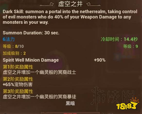 虚空之井:8,常用技能,触发流,召唤的宠虽然伤害才40%,但是继承人物的百分比几率触发电击,圣物被动攻击受到电击的敌人,会召唤一个闪电降临,造成100%武器伤,点满招8个宠,实际伤害并不低。