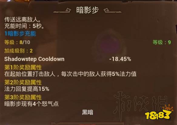 暗影步:8 ,常用技能,要个法力恢复和4次传送,如果不需要可以1级即可。