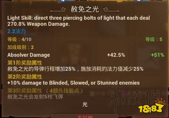 赦免之光:4级,技能不使用,要10%的对眩晕敌人的加伤,圣物点的1级电刑。击晕配合这个。