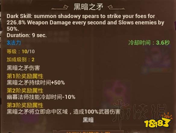 黑暗之矛:10,总12级,常用技能,持续性范围伤害技能,也能触发圣物的闪电降临。
