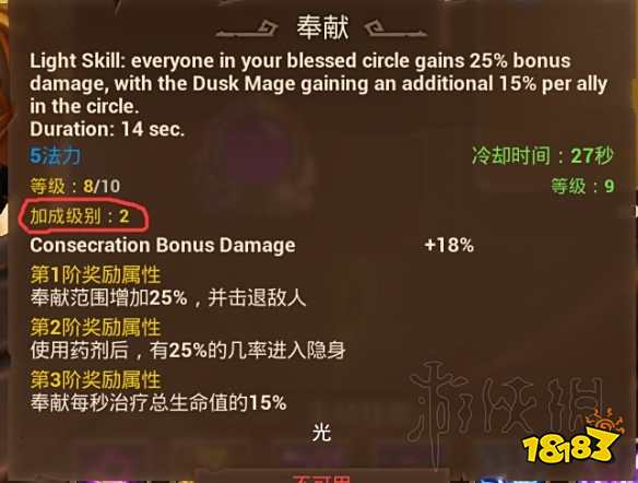 奉献:8级,必备技能,加满40的额外伤,有CD(8级其实就是10级了,有套装+2)。