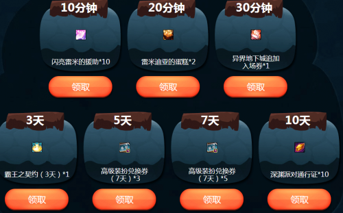 1、活动期间,每天游戏在线达到10分钟、20分钟、30分钟,可分别领取在线豪礼一份。