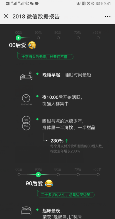 同时,报告也分析了每个年龄段使用微信的习惯,从00后统计到55岁以上的人群,可以看到每个年龄段人的生活作息。