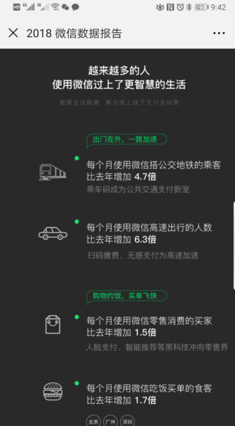 同时支付宝2018年度关键词,报告还有关于使用微信支付的统计。比如公交地铁支付增长倍数等等。可以看到人们使用微信支付的增势。