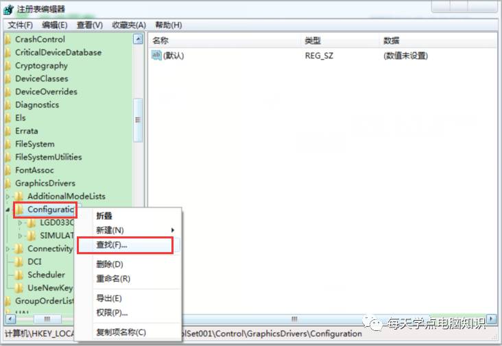 依次在左边找到:HKEY_LOCAL_MACHINE------SYSTEM------ControlSet001-------Control-------GraphicsDrivers------Configuration
