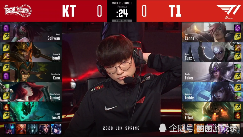 而KT这边上单选择了阿卡丽,LCK的比赛服是采用10.2版本,这个版本阿卡丽还没被削,打野选择了皇子,中单选了蛇女,下路女枪加锤石。T1这边的阵容找机会能力比较强,而KT这边则偏向打团。
