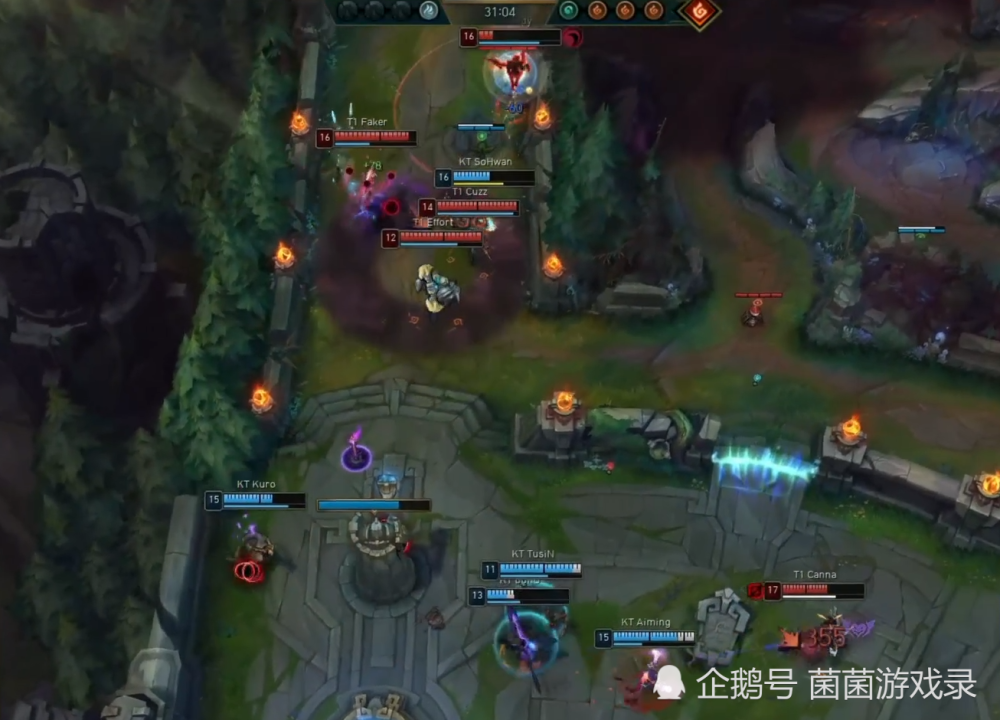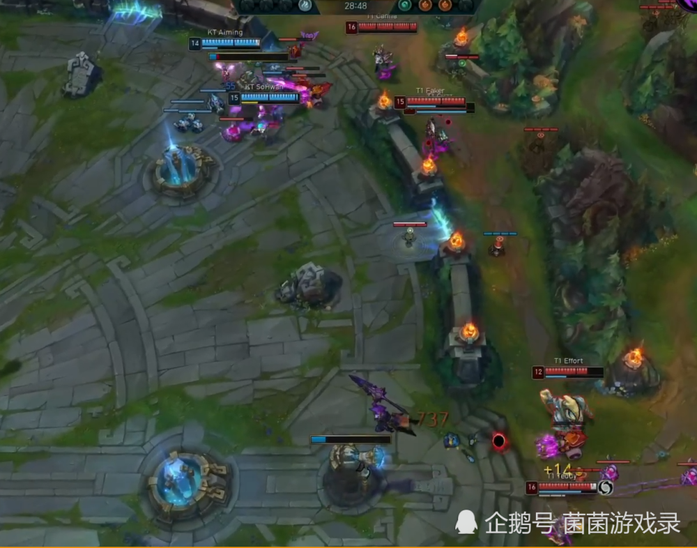 中期皇子想找机会打开局面,继续去下路抓,但是女枪被泰坦率先钩勾中,被秒掉了,皇子和锤石不得不撤退,传送下来的阿卡丽没人救也被击杀了,皎月再次拿到人头,前中期的KT实在是太难了。