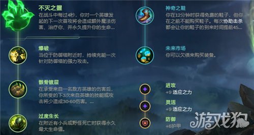 船长的天赋推荐选择不灭之握,无论是线上消耗还是续航,以及可以提升自己的生命值,不灭之握这个天赋自从偷钱天赋移除后就是最契合船长的天赋了。主系其它符文分别选择爆破、骸骨镀层以及过度生长,副系选择神奇之鞋和未来市场,这套天赋主要是为了让船长在对线期可以快速发育成型,后期也能保证足够的输出。