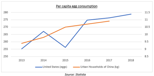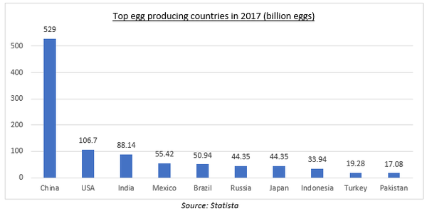 蛋是全世界人类饮食的重要组成部分。从全球范围来看,中国是蛋的主要生产国和消费国,每年生产5290亿枚蛋,其次是美国,每年大约生产1070亿枚蛋。除了母鸡、鸭子和鹌鹑之外,其他鸟类也是蛋的好来源,尽管总的百分比较低。这些国家和世界其他地区人均蛋消费量持续上升。