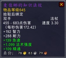 侵略者的遗忘宝藏除了能开除坐骑外,装等高达645的紫色装备也是应有尽有。比如下面这把麦佳娜的知识法杖,是不是很给力?