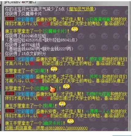 7、御前闯关,这个肯定有很多人不知道。触发条件是全区做的文墨任务达到10000个时,会触发御前闯关。当你看到系统提示(网上找不到图了),在长安城3个随机坐标会刷出三大学士。玩家需组队前去答题,答对得1分答错扣1分。当你的积分达到10之后,可以去李世民那领取一次奖励,可不要小看这个奖励,及其爆炸。去的越早奖励越好,上个图体会下