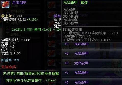 龙鸣套是60版本的一套35级重甲套装。以现版本的同级别装备水平看来炎蟒套装,他甚至不如烂大街的同等级的假紫装。不过在60版本,这套装却是家喻户晓的神级套装。在全套装集齐之后,会有一个HP降到25%以下时,增加25%攻击力的效果。