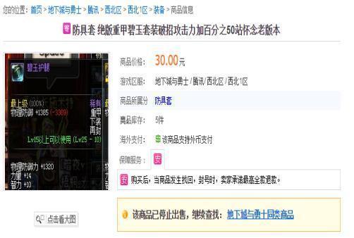 不过这套紫装早已绝版,目前在各大区中散件价格也十分高昂,但最有可能的是你根本找不到一套完整的。而在网络上,这套装备的现金售卖也都是停售状态,这足以证明这套装备弥足珍贵。