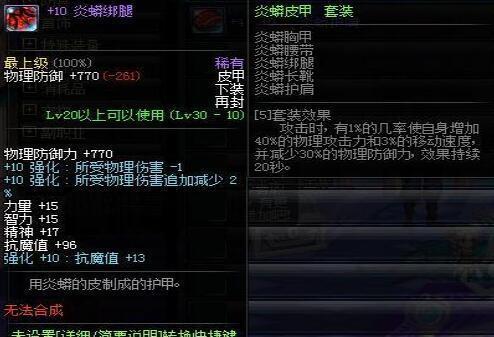 这是一套30级的紫装皮甲套。这套紫装甚至在80版本初期都还有不少玩家在强化使用。它的单件和其他几套一样,没有什么太大的看点。但在玩家集齐5件套后,会触发套装效果。这个套装效果是攻击时,有1%的概率增加40%的物攻和3的移速,并且减少30%的物理防御力。这个效果简直堪比90A,不过这个在后续的版本中,这套紫装早已和谐,成为历史。
