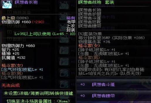 这是一套气功职业的专属45级紫装套。在各个散件属性上,均有气功的技能加成。整体来说,在当年版本还是一个不错的气功职业套。在五件套成套后,会获得一系列气功技能加成,此外还有一个物理攻击有1%的几率对自身施放LV5的光之兵刃效果。这个效果玩家们开始以为只对气功有效果,不过在其他职业穿上这套装时,也触发了这个效果。这让不少平A流职业获得了新生,特别是漫游和蓝拳,一度成为他们的最佳换装装备。