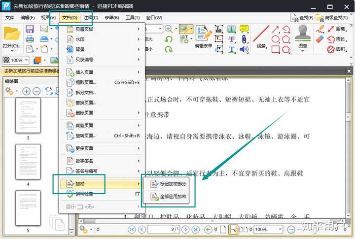 1:打开需要加密的文件之后,点击菜单栏中的文档选项,之后选择加密的功能,这时候会看到有两种加密的方式,一种是标记加密部分pdf编辑器怎么用,另一种是全部应用加密,这个根据自己的需要选择一个就好。
