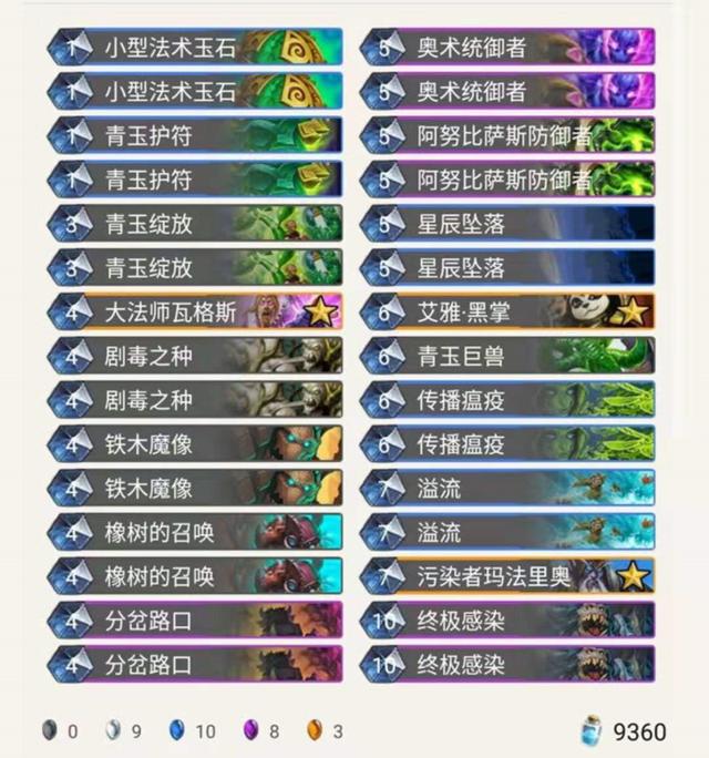 这套卡组中也是迎来了两位新版本"奇兵",青玉德经历了非常多个版本的不断改良优化,只要没有"它",还是依然有一定强度,非常适合念旧的你们玩。两位新朋友的加入也是更加贯彻了上个版本的玩法思路青玉德卡组,传播瘟疫、星辰坠落、终极感染以及溢流配合上阿努比萨斯防御者、奥术统御者是非常的恐怖。